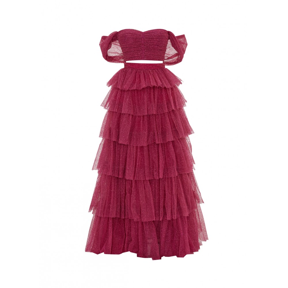Krótki top z odkrytymi ramionami, z połyskującego tiulu